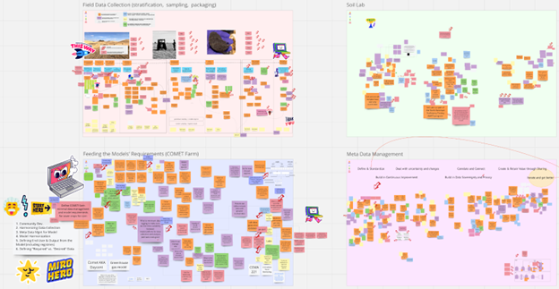 On Tuesday October 24, 2023, a diverse group of government, industry, and academic pioneers gathered for an “event storming” session to gain a shared understanding of the issues involved and solutions for “beta data management” systems involved with measuring soil carbon content and modeling the relationship between farming practices and change in soil carbon content, with a special focus on the United States Department of Agriculture (USDA) initiative to perform country-wide soil sampling and data collection which collects existing data, creates new data, and connects data with carbon models and researchers. Over the course of just a few short hours, the group had collectively produced an online whiteboard with over 2,000 pieces of information toward this goal.